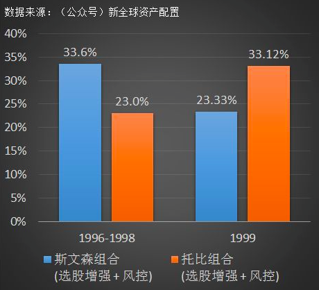 但是這2個策略,如果以年爲單位計算的話,也是有相對好壞的。比如說,1996年到1998年的3年間,斯文森組合每年都跑贏託比組合,3年下來一共跑贏了10.57%。如果你這3年持有的是託比組合,那你一旦跟斯文森組合比較起來,肯定很難受,而且人家是耶魯掌門人的模型的,肯定牛x的。