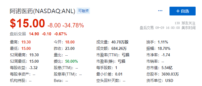 截至首日(9月29日)收市,阿諾醫藥(ANL)每股收報15美元,較上市發行價(23美元)跌去34.78%,目前市值爲5.54億美元。
