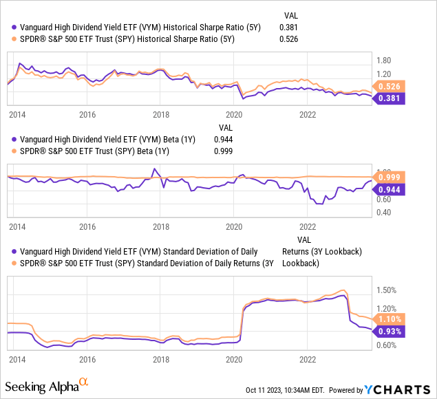 Compared to the S&P 500, VYM is usually a mildly lower-risk investment. Over the past three years, its overall volatility has been around 85% of the S&P 500 and has essentially always been lower over the past ten years. VYM's "beta," or expected price change given a 1% change in the S&P 500, is almost always lower. Over the past year, a 1% change in the S&P 500 is associated with a 94.4 bps change in VYM; however, in 2022, that figure dropped as low as 60 bps due to a decline in VYM's correlation. See its risk metrics below: