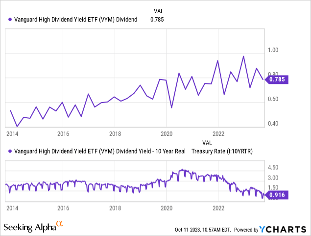 - VYM's dividend yield is currently just ~1% higher than the 10-year real Treasury rate, implying overvaluation to bonds of at least ~20%.