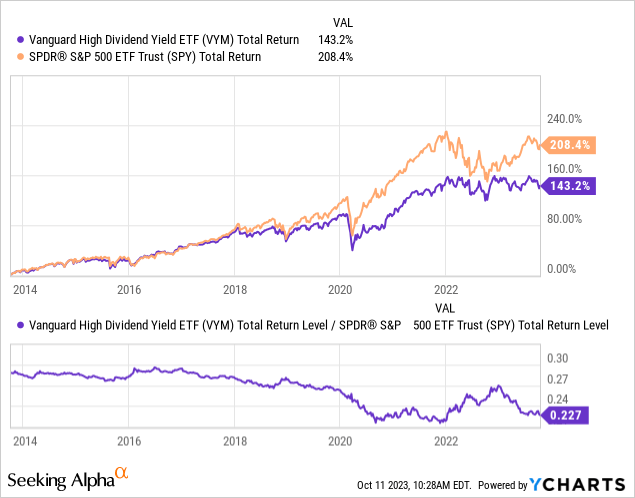 Over the past decade, VYM has underperformed the S&P 500 significantly, particularly since 2019. It has delivered a total return (including dividend reinvestments) of 143% over the past decade compared to the S&P 500 at 208%. See below: