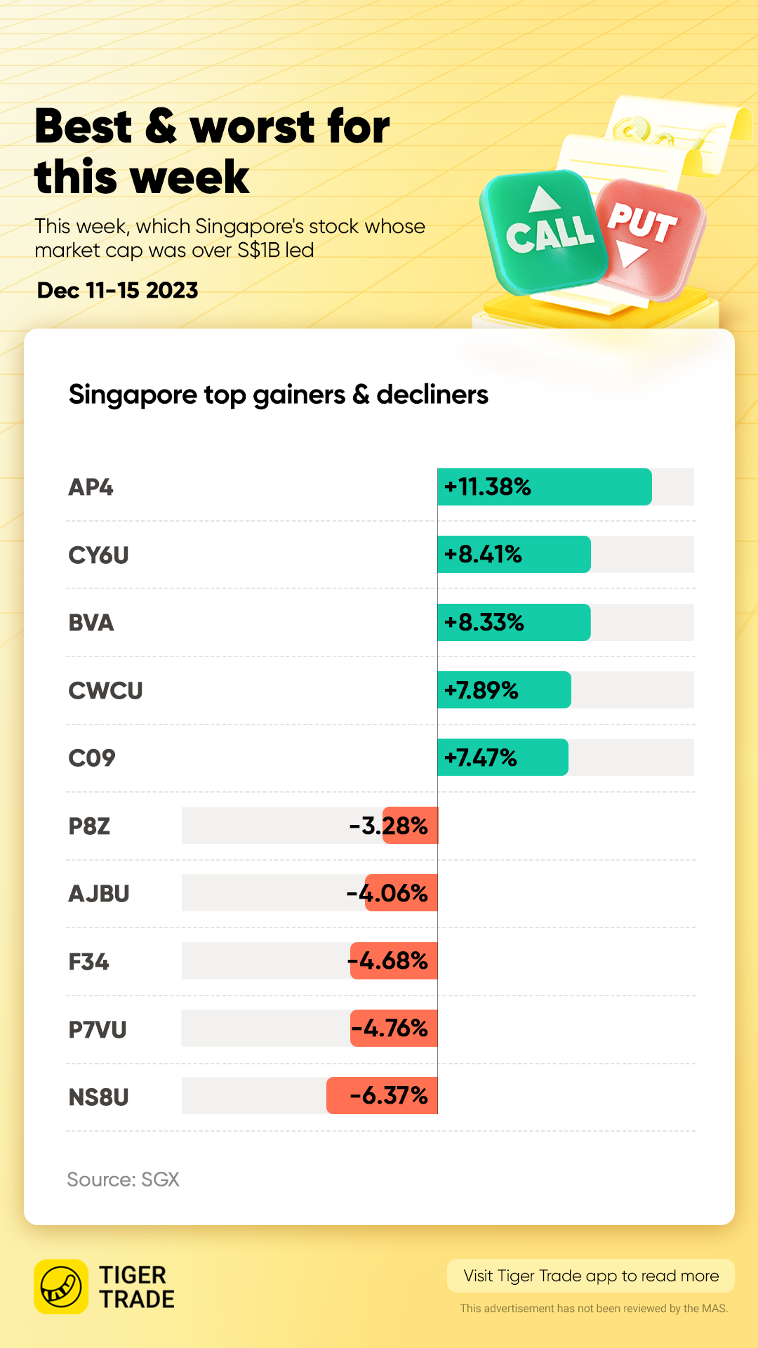 During the last 5 trading days, $Riverstone(AP4.SI)$, $CapLand India T(CY6U.SI)$, $Top Glove(BVA.SI)$, $Cromwell Reit SGD(CWCU.SI)$ and $CityDev(C09.SI)$ are the top 5 weekly gainers, up 11.38%, 8.41%, 8.33%, 7.89%, and 7.47% respectively.