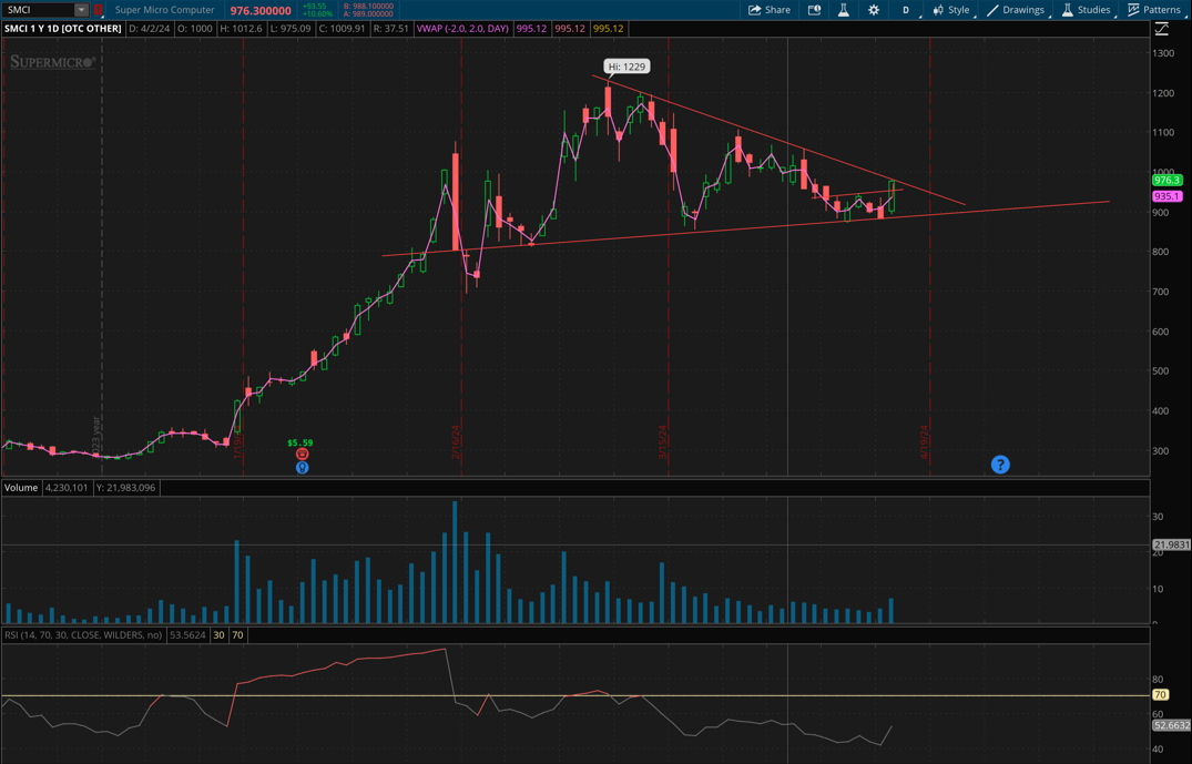 $SUPER MICRO COMPUTER INC(SMCI)$ I am not bullish yet. Can’t have one single reason of one analyst upgrade pumping to 10%, just the AI pump is back. No fundamentals at this point. The wedge when it breaks, can add a small portion for moving forward. Currently risked 1 option PUT 2 month expiry. Will decide to keep it or sell for loss by end of this week.. Short term volatility and I am expecting move in either direction - 950$ and 1050$ both are possible to be touched by Friday..