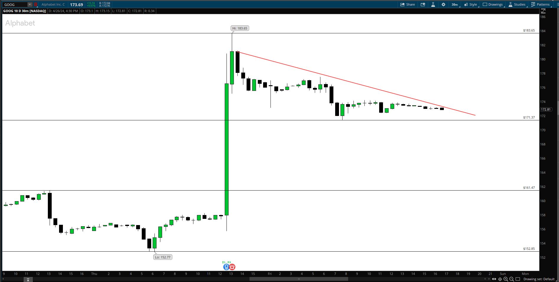 $Alphabet(GOOG)$ levels for the week ahead on the 30 minute chart. Big breakout on earnings last week. 171.3 has to hold as support or else this can trickle back down towards 162. Would love to see a strong bullish breakout Monday .It'll be important to monitor the price action closely, especially around the support level of 171.3, to assess whether the bullish momentum continues or if there's a reversal in the trend.