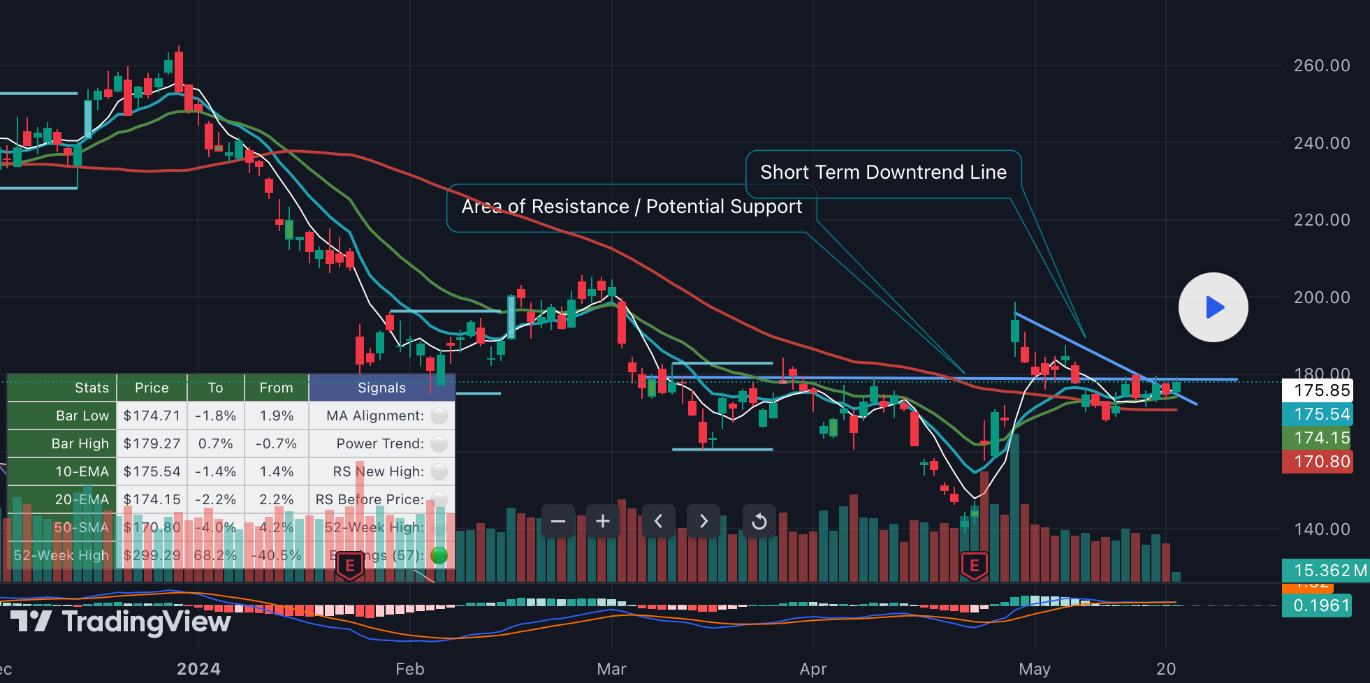 $Tesla Motors(TSLA)$ I had an alert set on the Area of Resistance Line on this chart. It triggered this morning and I have taken a ½ size position in anticipation of that becoming support. I do not know if it will play out that way so I have a stop under the 50 DMA (red) which would a 4% position risk. Should it move up and over the resistance area I will look to add. All TBD.