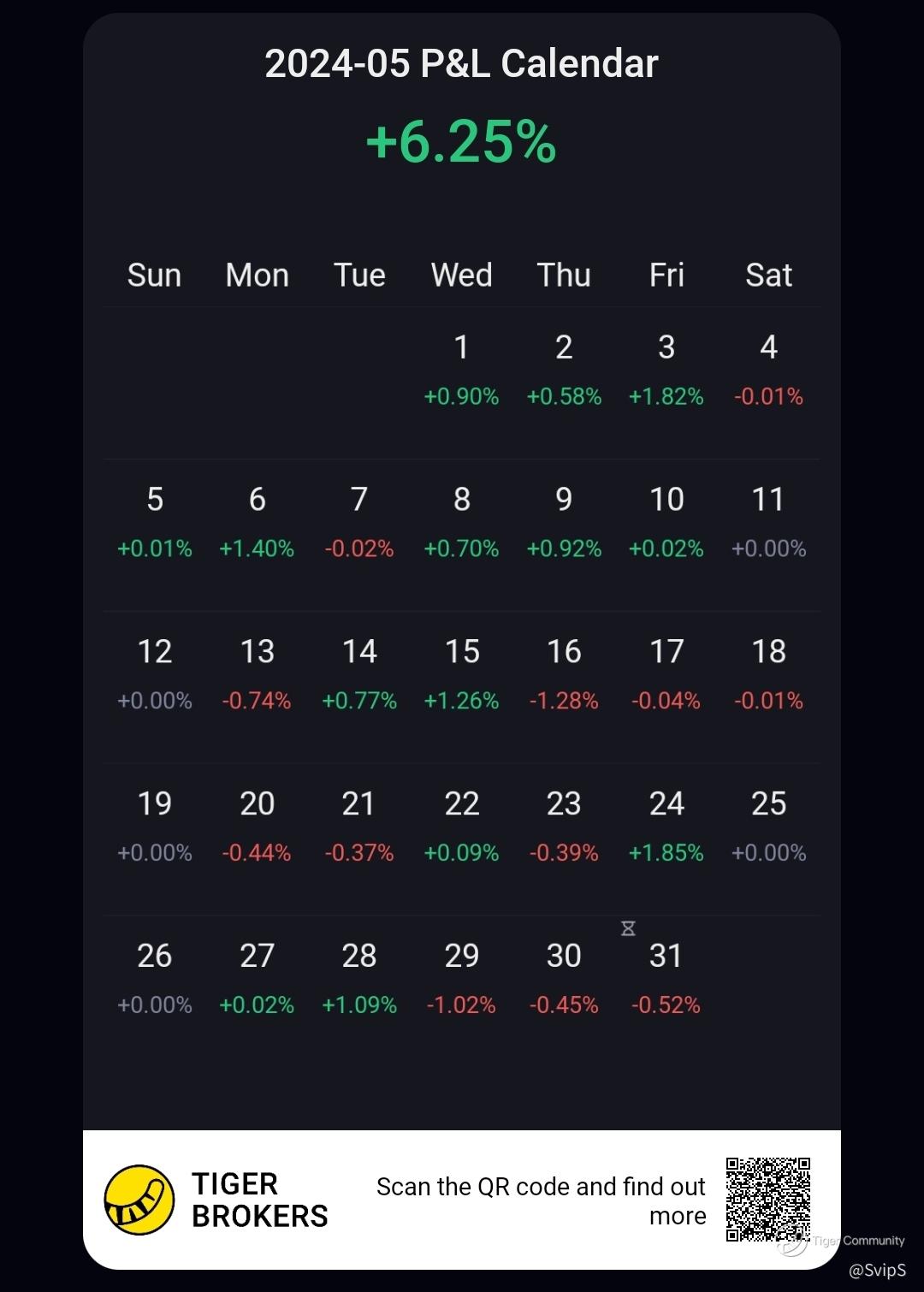 $Tiger Brokers(TIGR)$ Manage to secure at least 6% increase Mth to Mth in May. [Cool] There might be a small correction in coming Jun to Jul due to long uprising market in the past months, stablelise between Aug to Sept before a hight chance seeing bullish action from Oct till Dec ( Fed had not impose the 2 rate cuts they initially plan). Would that be a opportunity along till end of the year? Monitoring and keep a look out.