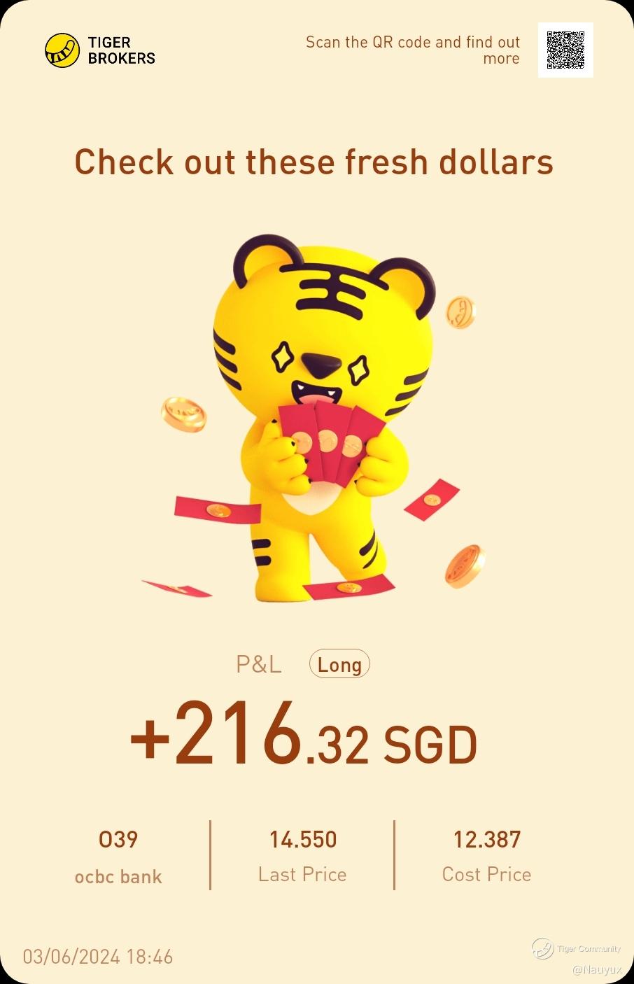 $ocbc bank(O39.SI)$ I bought 1 lot last year, good buy haha