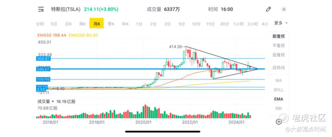 3) 特斯拉下跌33%。還是在長期的下降趨勢中,和其他六巨頭大不同,離幾年前的歷史新高還遠呢。目前價格困在下圖的三角形(類似一面旗幟)的範圍,看接下來幾個月是向上還是向下突破。木頭姐的ARKK基金自從4月逢低買入後,5-8月一直在賣出。