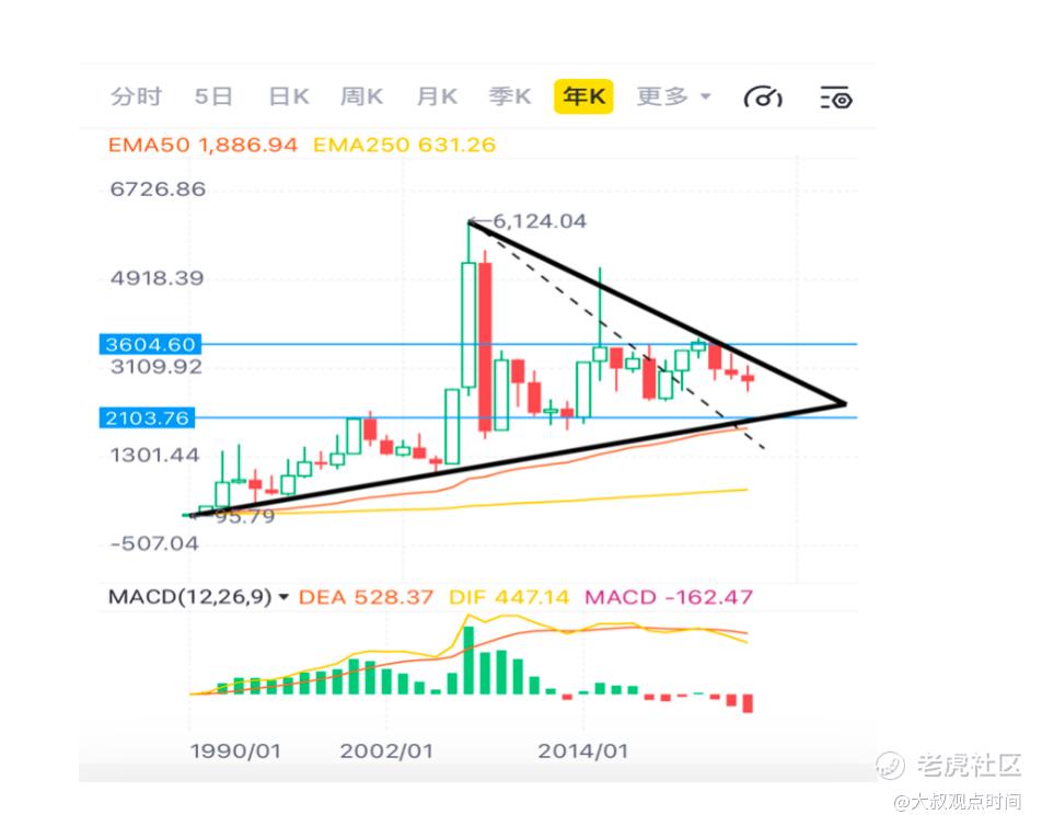 那條和50-Period的平均移動線相似的黑色向上實線是長期的支撐線,和黑色向下的阻力線形成一個三角形,像一面旗��。後市的走勢要麼收復今年的失地向上突破形成新的行情,要麼繼續向下再測試有史以來(1990年開始)的長期支撐。需要我們長期的耐心來等待和驗證。