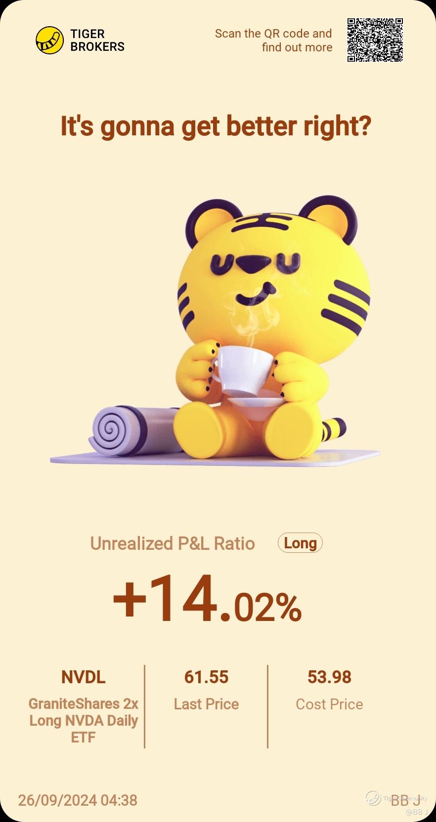 $GraniteShares 2x Long NVDA Daily ETF(NVDL)$ Continue to hold the line as my conviction for NVDA is still intact. Target at least another 30% upside for 2× long NVDA, ie NVDL in 2024!! However, a strong heart is needed for a deep volatility!! Gonna get better right before the month of Christmas season??