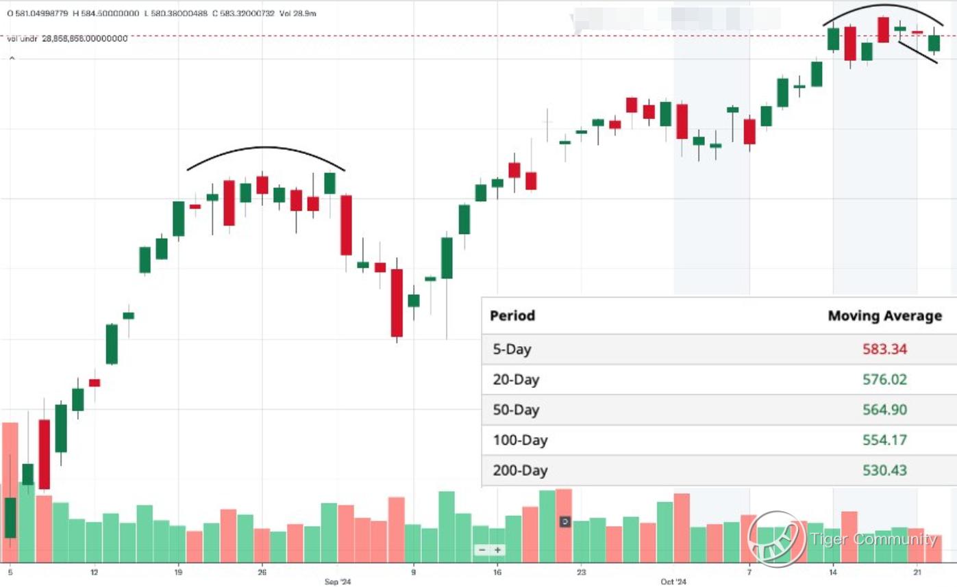 The SPY is showing a bearish development, forming a rounded top with a pattern of lower highs and lower lows. It closed right at the 5-day simple moving average, signaling exhaustion in the market. It appears that the market is tired and may be on the verge of a significant downward move. After nearly two weeks of watching, I believe the setup is aligning, and I’m considering taking a put position to capitalize on the potential drop, as the trap door could finally open.