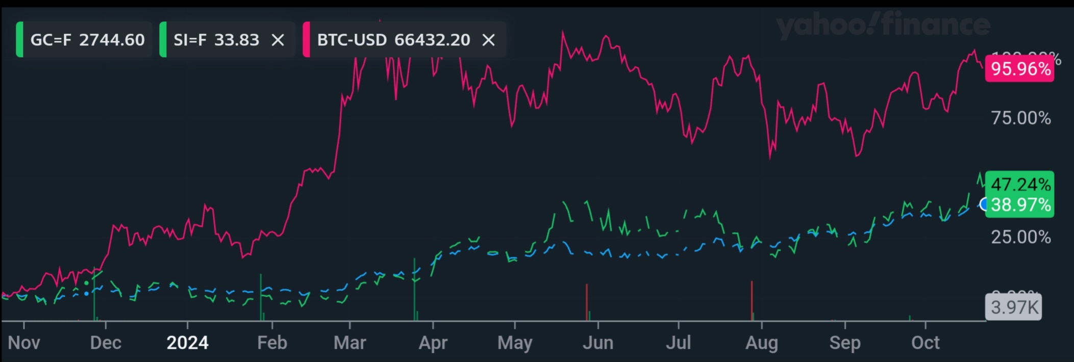 It's great to see that you're keeping track of your investments. Based on the performance over the past year, it's clear that $Bitcoin(BTC.USD.CC)$ , $Gold - main 2412(GCmain)$ , $Silver - main 2412(SImain)$ have shown significant growth: