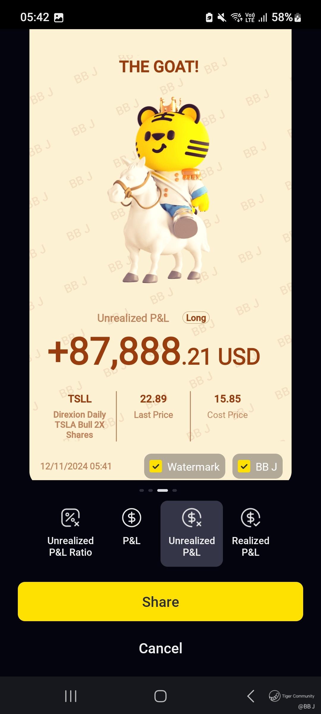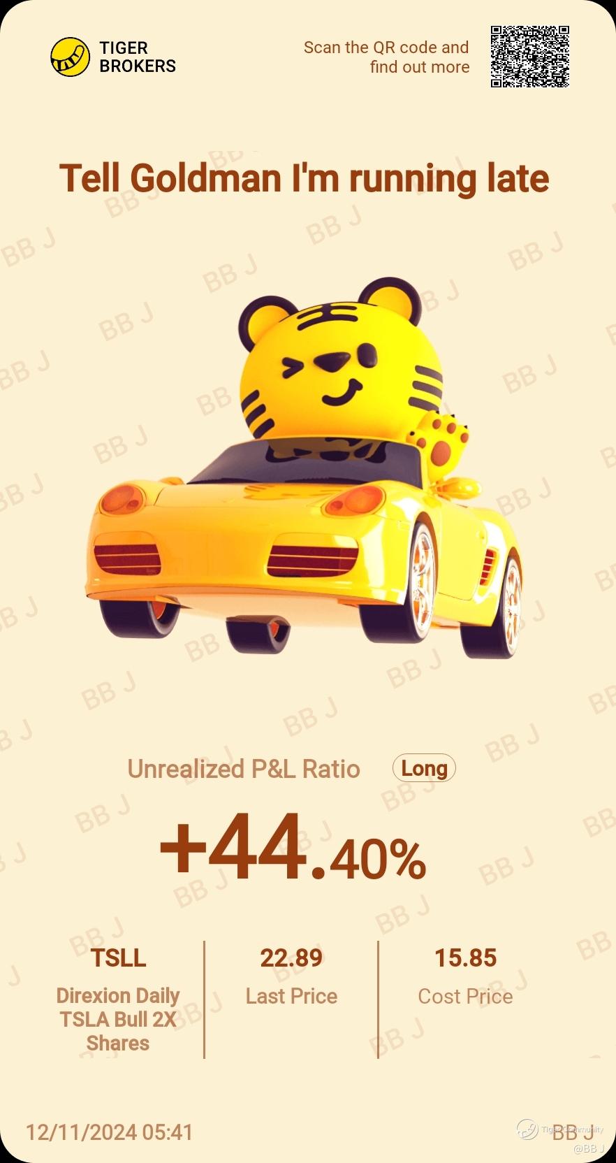 $Direxion Daily TSLA Bull 2X Shares(TSLL)$ Added more 2X TSLA ,TSLL on last Friday 8th Nov 2024 when it had gone up almost 43% since my first buy at 11.58! Was thinking it could go up a lot more till TSLL reaches $30, that's when TSLA is at $414 by end Nov. So the reap for just 4 days is very rewarding . Cheers![Sly] I will convert TSLL to TSLA when I feel the high sentiments turns to the anothr page...or when I want to take lesser risk on the downturn...
