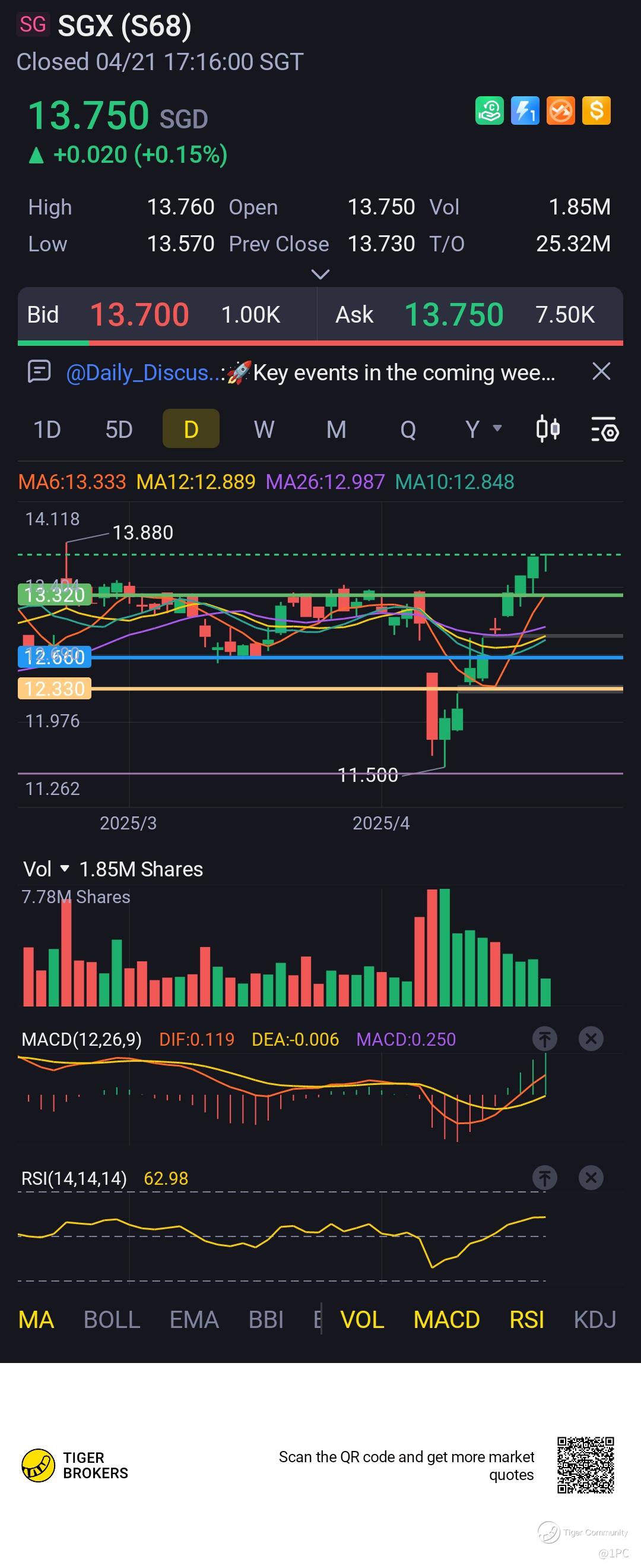 $SGX(S68.SI)$ $SGX(S68.SI)$ S68: Resilence Amid Market Waves. S68 continues to shine, showing đŞ resilient against the STI index. Closing today at SGD 13.75. S68 hovers close to it's previous High of SGD 13.90, leaving investors debating the next move [Thinking] . MACD: The Golden Cross remains intact on its 4th day, signalling sustained bullish momentum. RSI: At 68.69, S68 approaches overbought territory, indicating đŞ buying pressure but also hinting at potential consolidation. To Sell or Hold[Thinking] ? Take Profits: With the recent high SGD 13.90 serving as resistance level, this might be an opportune moment to lock in gains [Chuckle] OR Hold for Next TP: Based on Fibo-Projections, potential TP levels include: SGD 15.80(138.2%) for ST Resistance. SGD 16.28. (161.8%) for MT Bullish continuation, & SGD 17.06. (200%) for LT Optimism. [Thinking] .... I will Monitor the TP or the ST one [Chuckle] [Chuckle] [Chuckle]