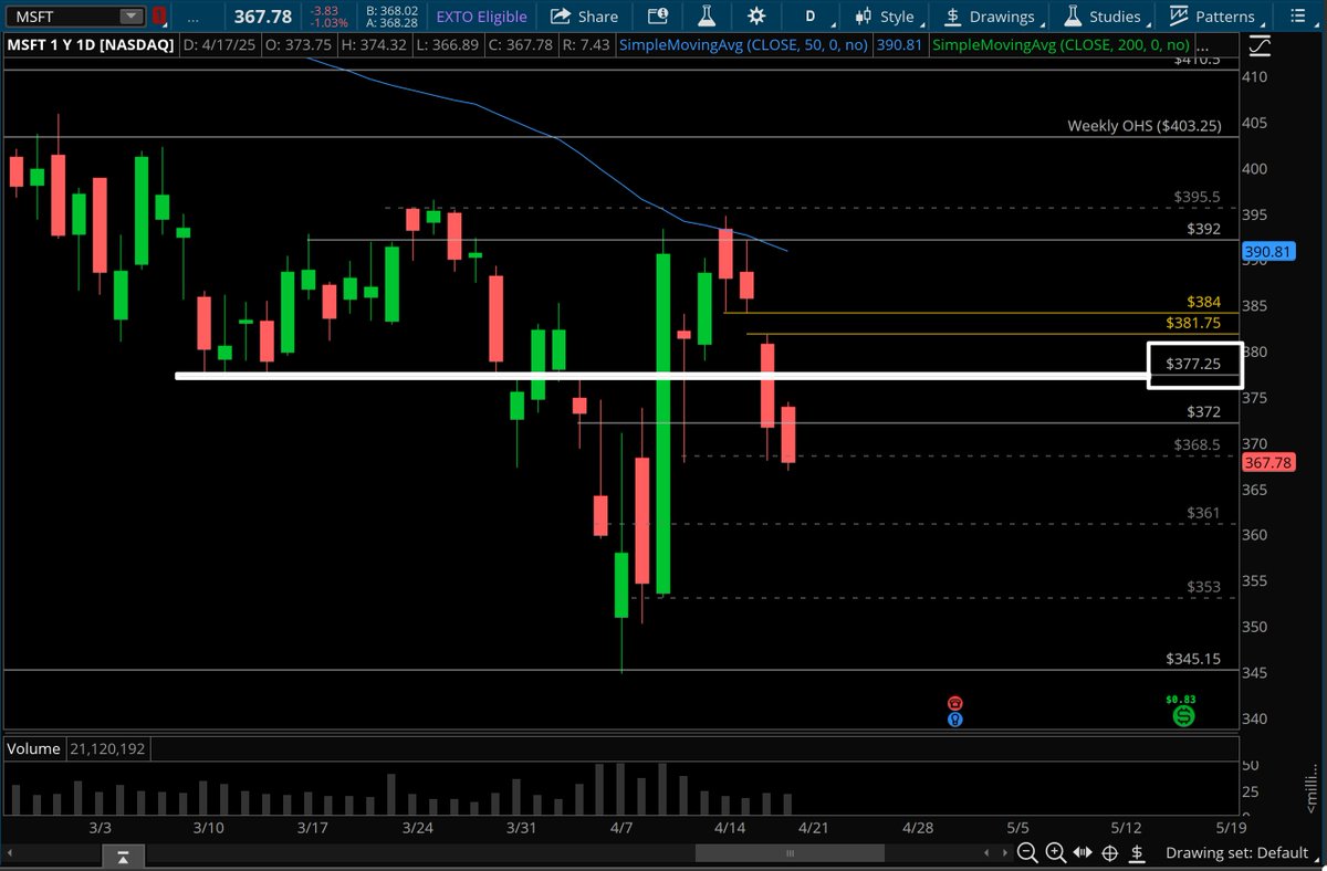$Microsoft(MSFT)$ MSFT– Critical failure below 377.25 on Wednesday intraday. Not like we gapped below the level and couldn't recapture... Spells trouble for bulls and not unreasonable to see movement towards 361 and 353. If there is a recapture, higher lows over the level can target 392.