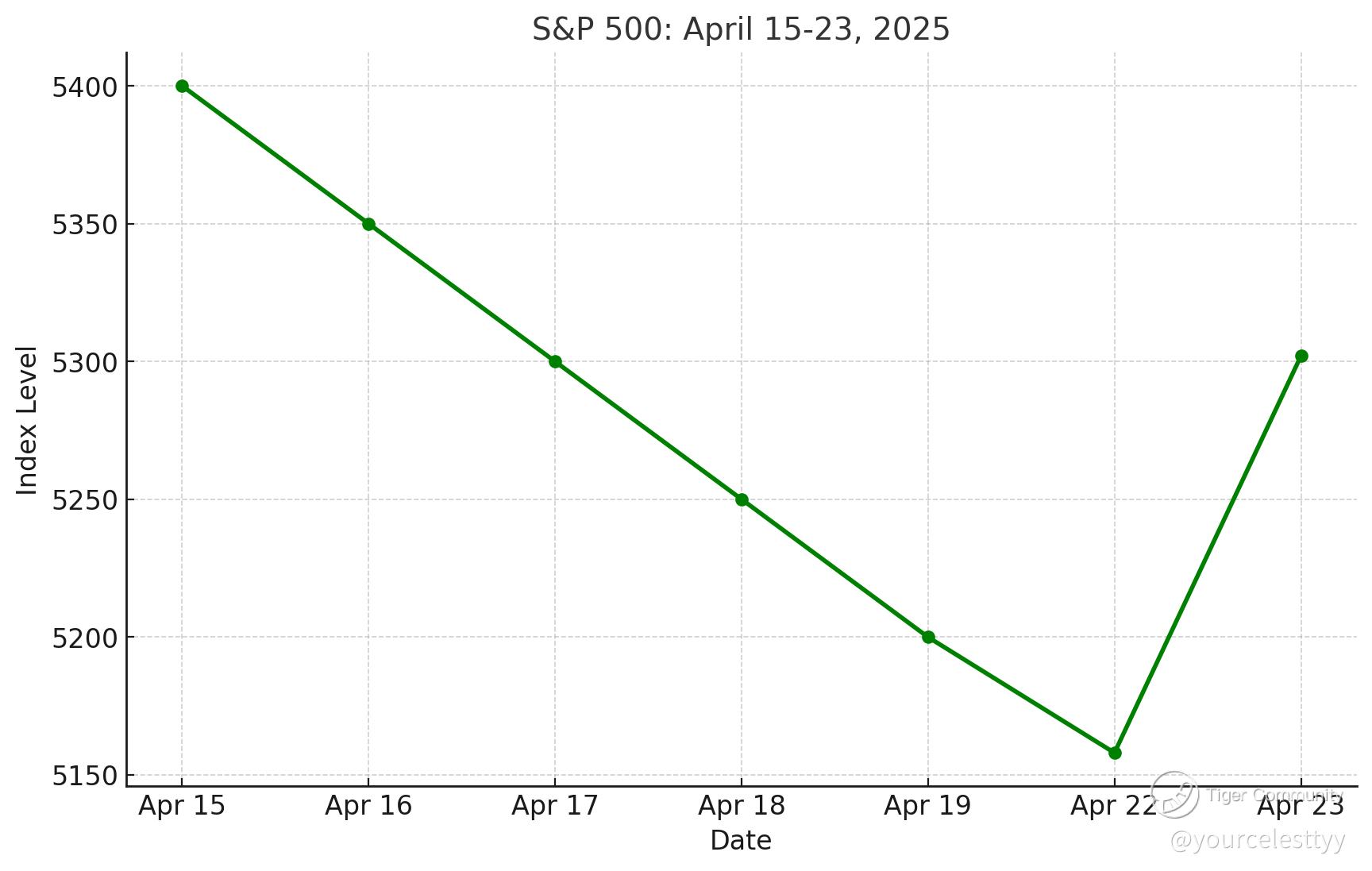 S&P 500 Rebound: After a steep drop to 5,158 on Monday, the S&P 500 surged 2.8% yesterday to close at 5,302. Investors cheered President Trumpâs assurance that Fed Chair Jerome Powell isnât going anywhere, calming fears of monetary policy shakeups. The VIX (volatility index) eased from 34 to 28, signaling a less jittery marketâbut donât get too comfy yet!