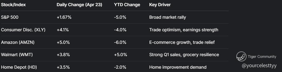 Consumer discretionary stocks are leading the charge, with e-commerce and retail giants driving gains. Here’s a performance snapshot as of April 23, 2025:
