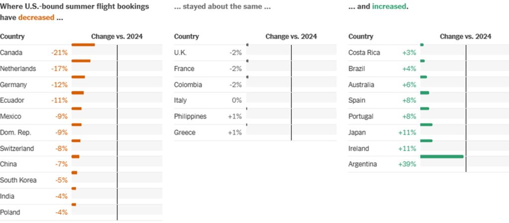 International tourism has collapsed from certain countries, while increasing from others. Compared to some sensational headlines, the aggregate effect is estimated to be a roughly 1.5-2.0% drop in international tourism during the summer months.