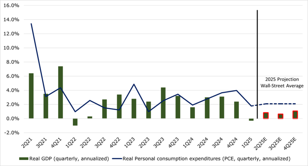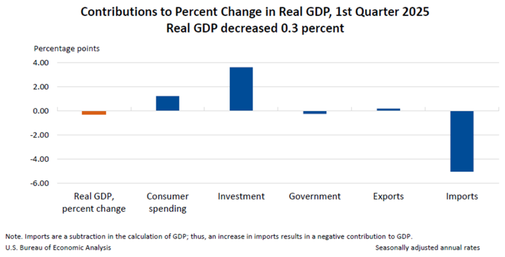 Real GDP contracted by 0.3% for the quarter ending March 2025. Imports during the first quarter surged 41.3%, the largest since the global economy restarted post-pandemic in the latter part of 2020. As we have discussed before, this effect was mostly due to importers front-loading inventory orders to avoid tariffs and gold moving from LBMA to COMEX.
