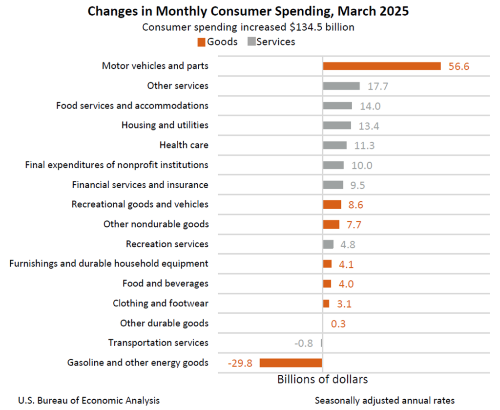 Most of these effects were weighted to the latter part of the quarter, and as a result consumer spending increased 2.3%. While still strong, 2.3% is a slowdown. Similar to imports data, the largest single category increase was motor vehicles and parts, indicating that consumers are also front-loading large purchases before tariffs hit. This is not surprising, as the largest single import from abroad is automotive and automotive components.