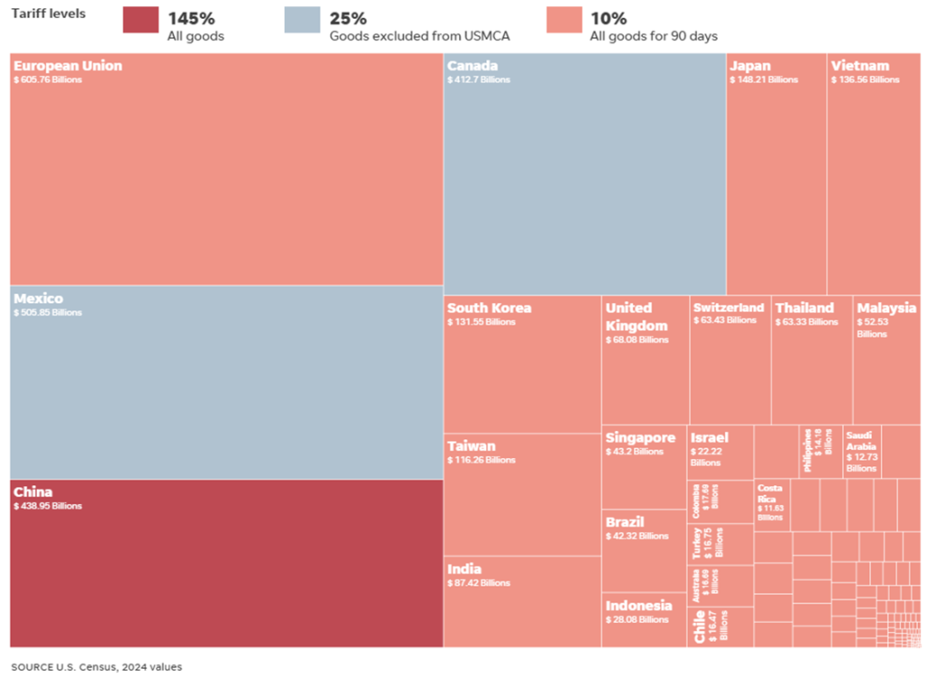 Still, 10% tariffs remain in place across the board on all countries, 25% on goods like steel and aluminum from Mexico and Canada, and 145% on all goods from China. The full host of tariffs will come into effect starting July 8th. Below is the current summary which is subject to and will change.