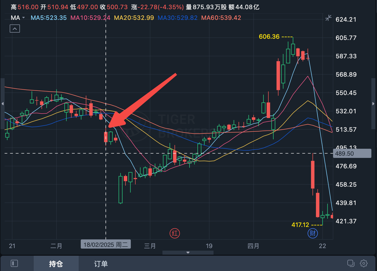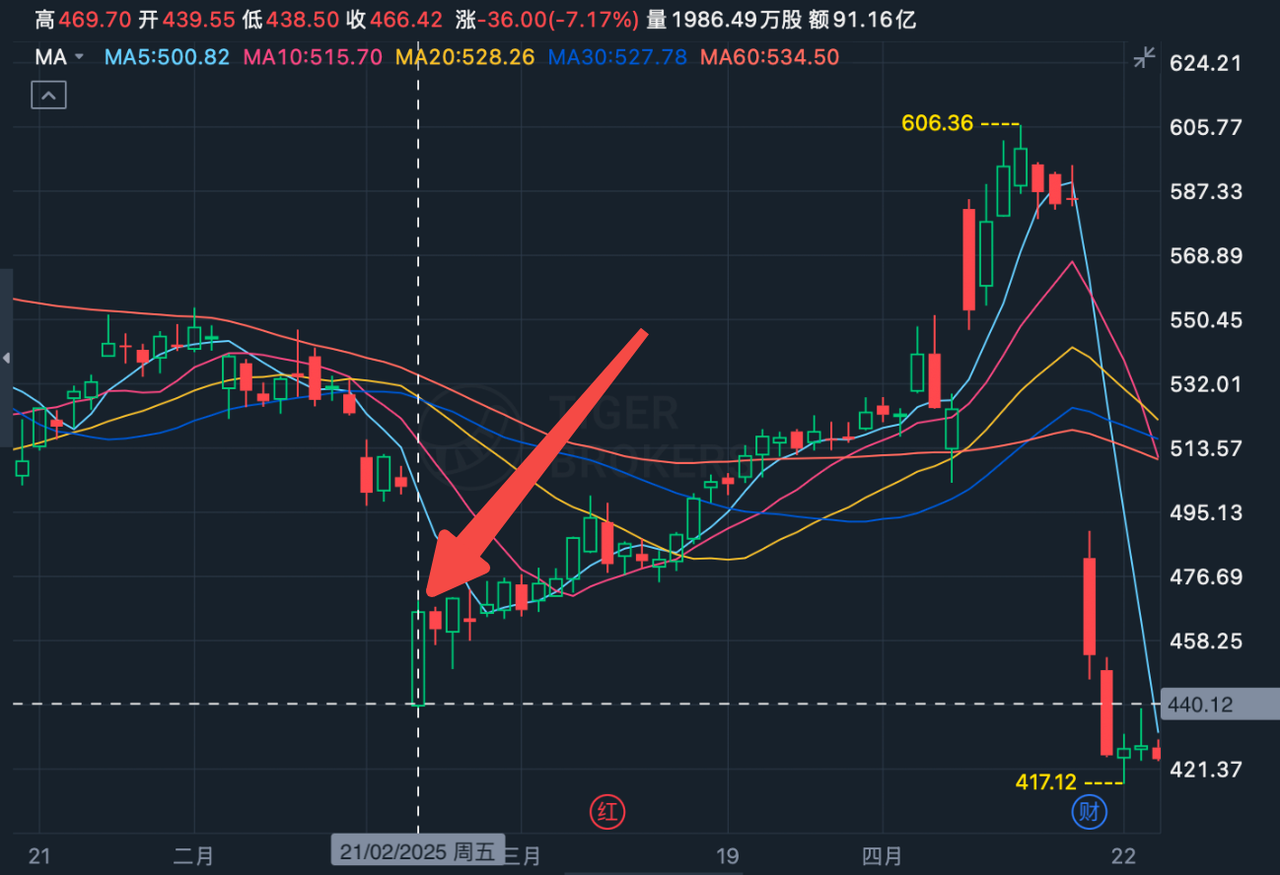 On February 21, the stock opened lower, briefly dropped 10%, then recovered to close down 7%. Later that day, 7 executives sold 27,000 shares at $466.42.