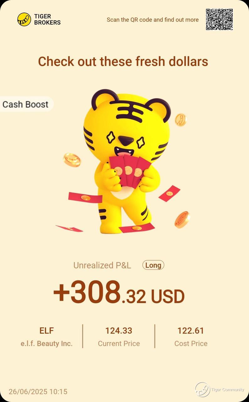 $e.l.f. Beauty Inc.(ELF)$ making me glow with $308.32 gains! Price up from $122.61 to $124.33. This beauty disruptor proves quality doesn't need luxury price tags! With viral TikTok fame and retail expansion, ELF is riding the wave of beauty industry transformation at full speed!