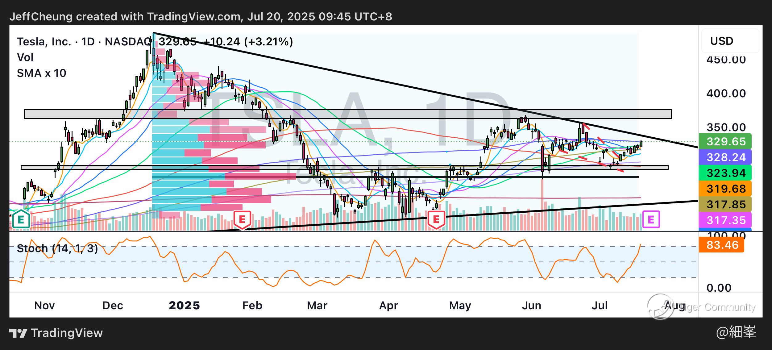 • 支撐位在 $320(短線)、$305(中線);阻力區間爲 $350–$355、$365。