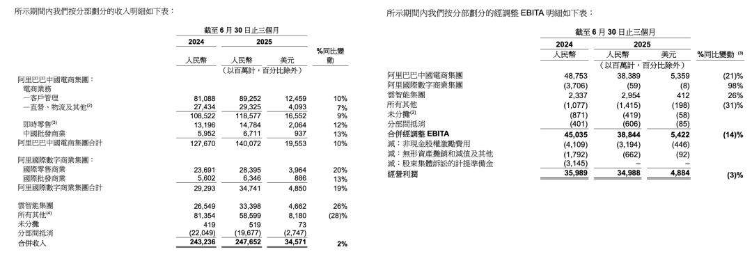 現金流顯著下滑,歸因於淘寶閃購的投入和雲基礎設施支出的增加。以下是阿里分項業務的收入和EBITA利潤。財報全文可點擊文末左下角閱讀原文查看。