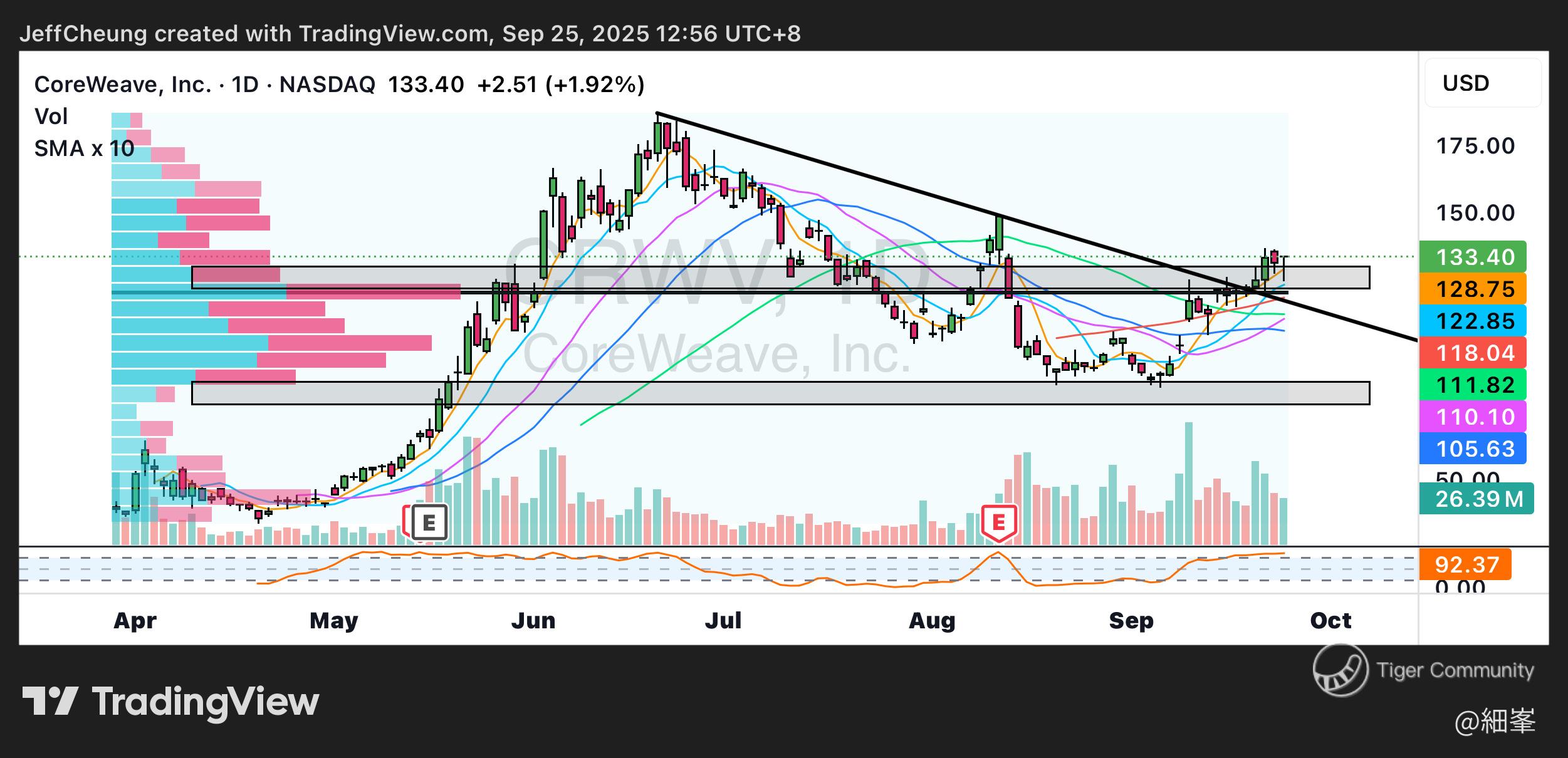 $CoreWeave, Inc.(CRWV)$ 在大市回調中依然能堅挺和嘗試突破後整固, CRWV能否頂着NVDA的光環,站在AI'基建'的風口上逆市上漲?讓我們一起來分析一下吧: