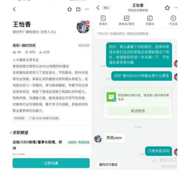 無獨有偶,2025年7月網絡上瘋傳一張所謂求職者“王怡香”的簡歷截圖,內容露骨地暗示其與前領導有不正當關係,並在與招聘方對話中公然“開黃腔”。此事迅速登上微博熱搜,起初公衆譁然以爲平臺審覈形同虛設,又出現涉黃招募新套路。