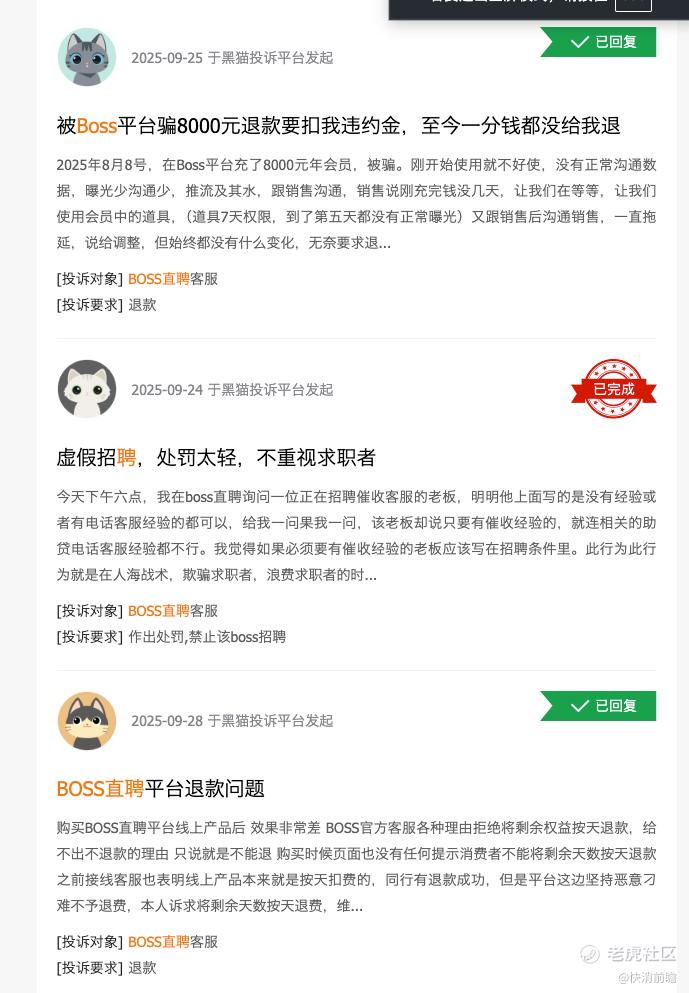 在黑貓投訴上,大量用戶直言自己的BOSS直聘使用體驗:“流量少,效果差”“退款訴求被拒”“收費與服務不符”“價格貴得離譜”……