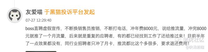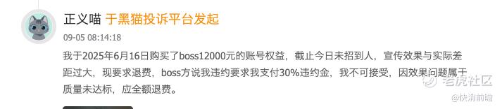 還有消費者表示自己花了12000元的賬號權益,卻將近三個月了也沒招到人,認爲宣傳效果與實際效果差距過大,該用戶想要求退費,boss方卻說違約要求支付30%違約金。