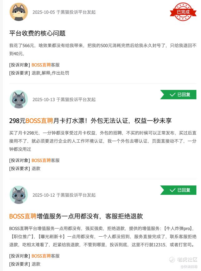 其中,內容大量集中於收費爭議、誘導消費、虛假宣傳、不退退款、亂扣費用、服務質量差等方面。許多用戶直指BOSS直聘存在“收費太猛,企業快用不起了”。