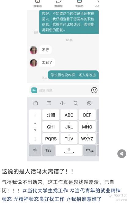 即便是日常的求職溝通,平臺監管也頻頻失守。“外貌羞辱”事件就是一例。2025年5月,深圳的陳女士在BOSS直聘投遞某財務公司文員崗位時,竟收到對方回覆:“不行,太醜了”,言辭粗鄙。涉事公司負責人事後對媒體辯稱是下屬所爲、讓大家“不要當回事”,引起更大爭議。BOSS直聘官方兩天後迴應稱已對該招聘賬號採取限制措施,並要求招聘方學習平臺文明公約。
