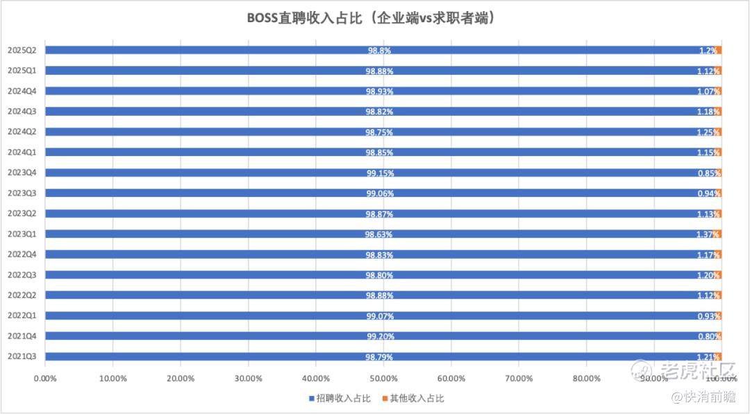 然而值得注意的是,根據最新財報數據,BOSS直聘2025年第二季度收入中,有99%來自於企業端。這一比例自2021年公司上市有財報可追溯起就維持至今,面向C端求職者的增值服務收入佔比長期不足1%。