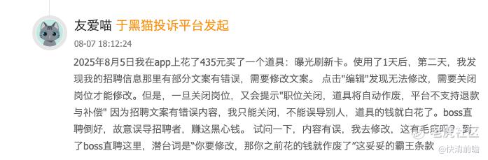 另一位用戶則投訴自己花435元購買了一張“曝光刷新卡”道具,但僅使用一天後發現招聘信息有筆誤需要修改。一點擊編輯卻提示必須關閉職位才能改,而一旦關閉職位道具立刻作廢且不予補償。爲了避免誤導求職者,他只好忍痛關閉崗位,白白損失了幾百塊錢。