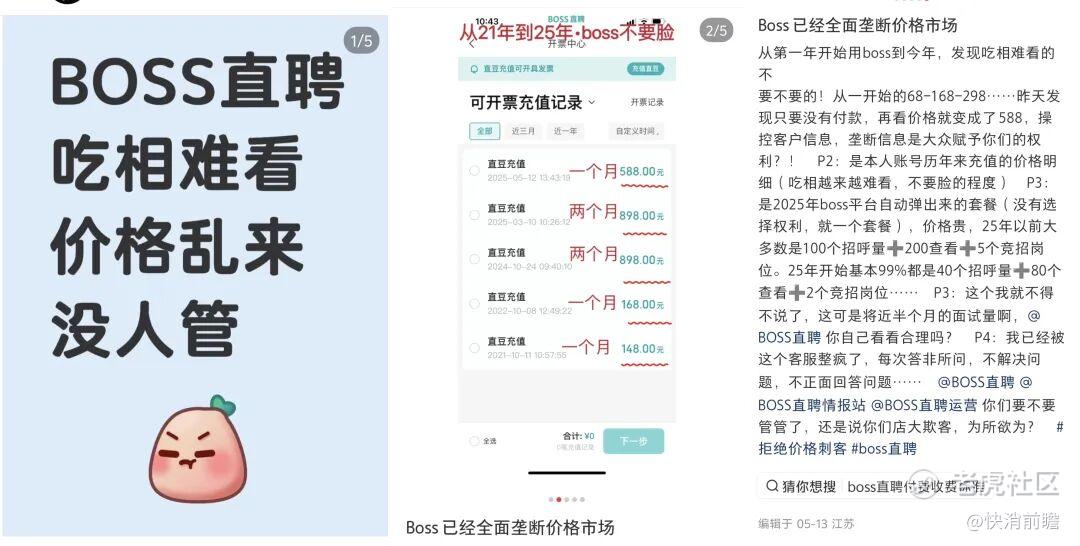 BOSS直聘的收費名目也隨之日益繁複:從“直豆”(站內虛擬幣)到“牛人直通卡”、“簡歷刷新”、“競價排名”、“優享套餐”,凡是能提高招聘效果的服務都被拆解出來明碼標價。許多HR抱怨,平臺有時會通過調整算法故意降低未付費職位的曝光量,倒逼企業購買增值服務,屬於典型的“誘導消費”。再加上前文提及的競招職位動態調價機制,以及對違規判定和賬戶封禁的不透明規則,不少用戶認爲平臺制定了一系列對己方有利的霸王條款。