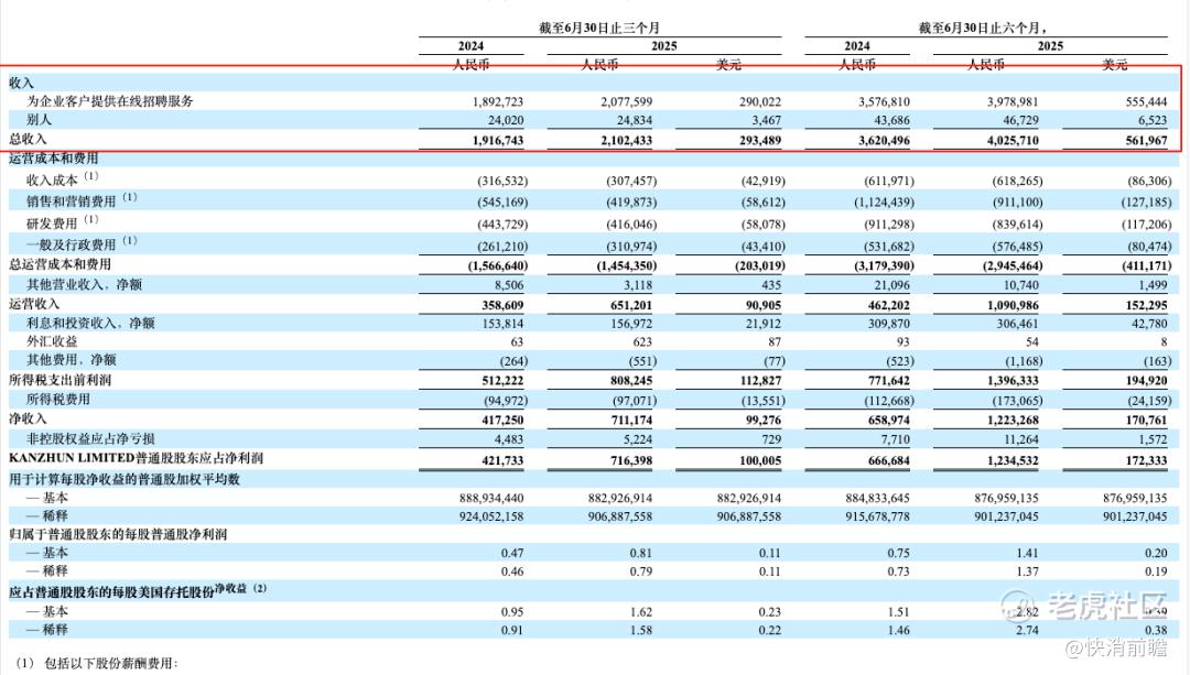 在這半年裏,BOSS直聘的收入爲40.257億元,同比增長11.2%;該增加主要是受付費企業客戶增長所推動。