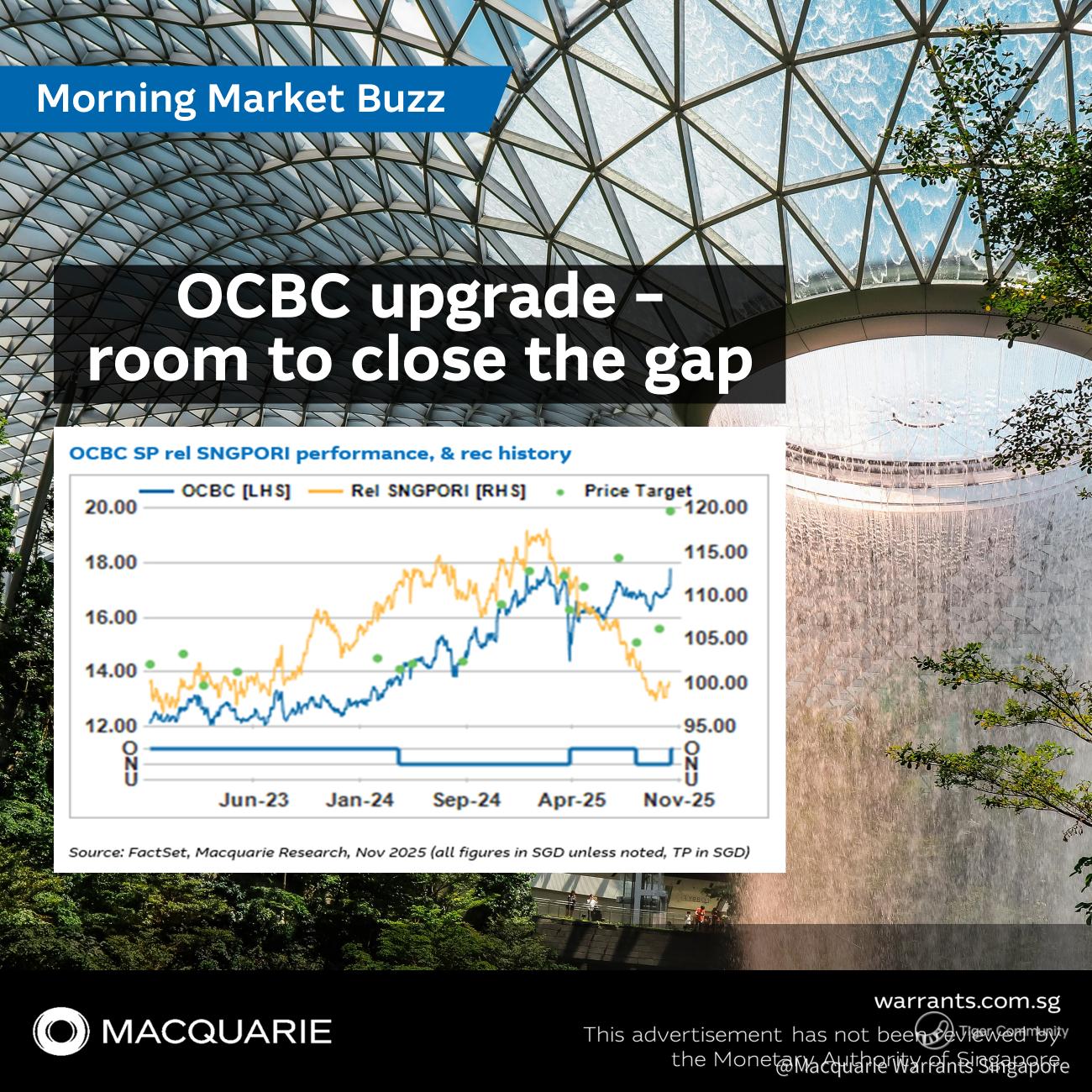 MQ upgrades OCBC to Outperform with a S$19.90/share price target. OCBC's P/B and P/E relative discount versus DBS is the widest in at least a decade.