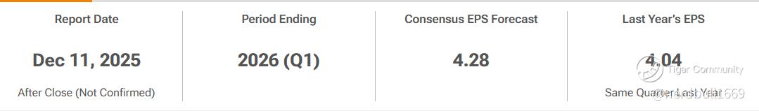$Costco(COST)$'s upcoming Fiscal Q1 2026 earnings release scheduled for Thursday, December 11, 2025 (After Market Close).