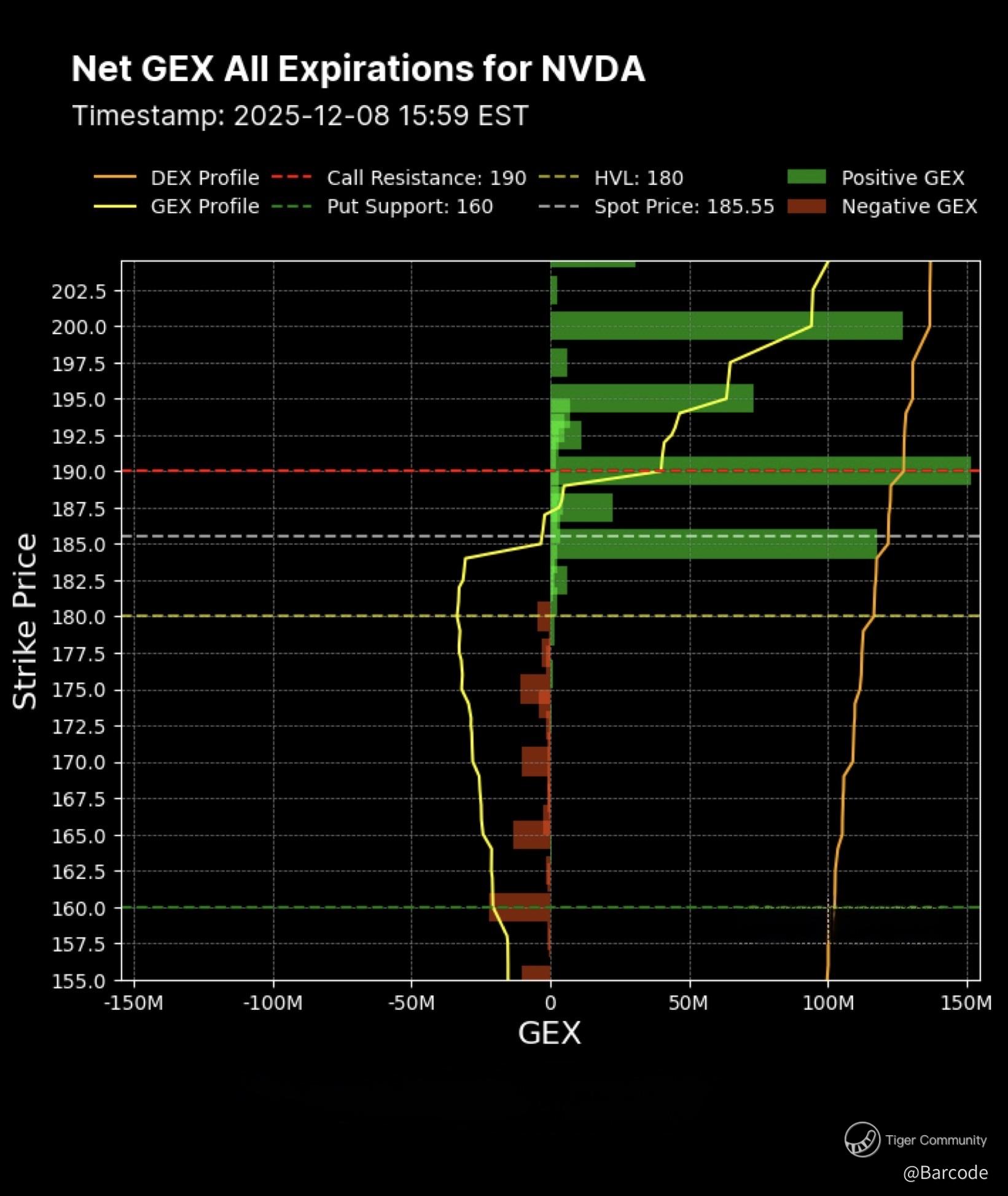• $NVDA’s gamma profile warns of volatility between $180–$190 with Call Resistance at $190, Put Support at $160, HVL at $180 and spot around $185.55, implying pin risk near 185 to 190 unless catalysts like H200 China orders or further export relaxations emerge.