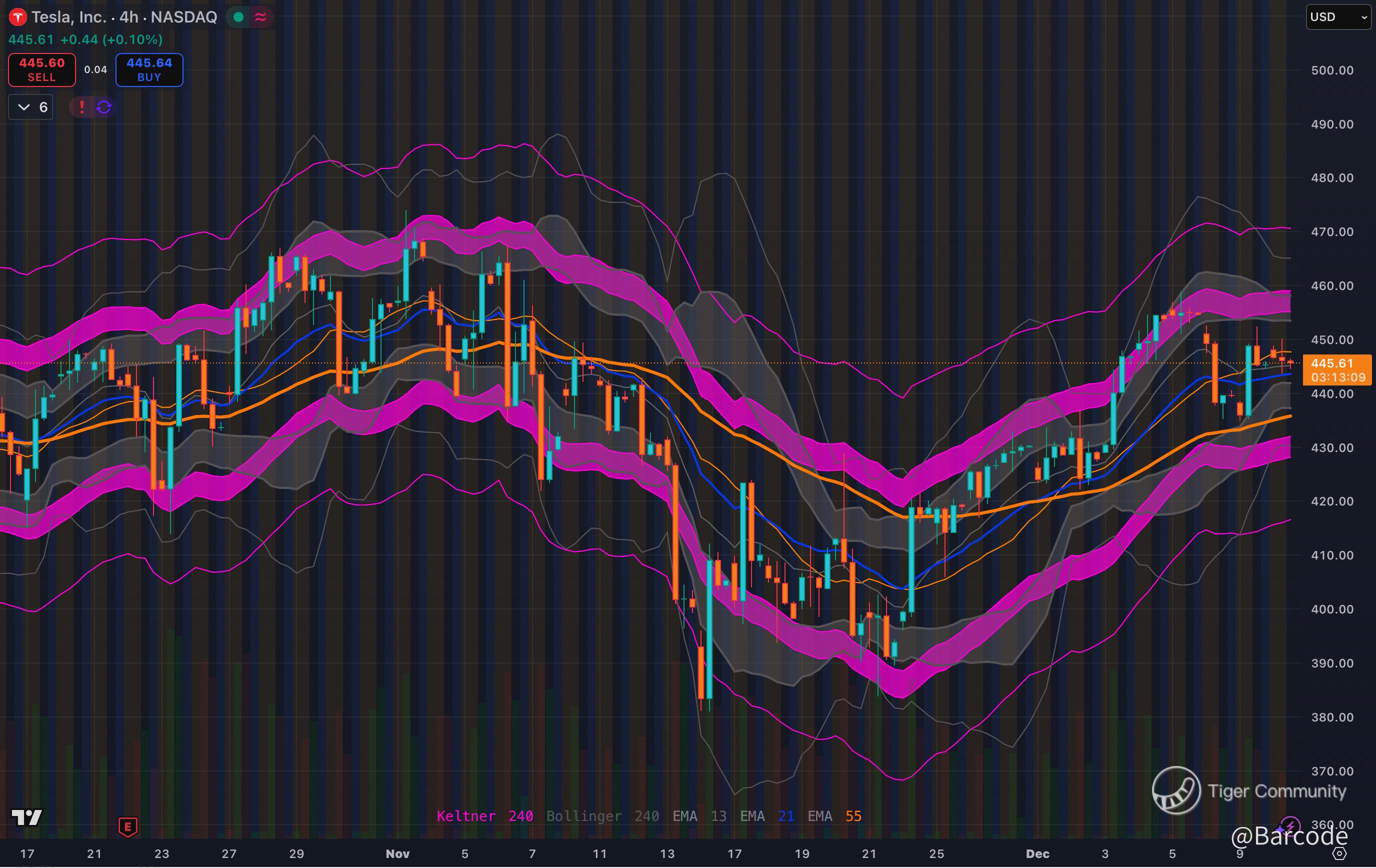 On the 4H chart, Keltner and Bollinger compression confirms volatility storage. EMAs are rising beneath price which is constructive. Every time $TSLA tests the lower bands, institutions step in.