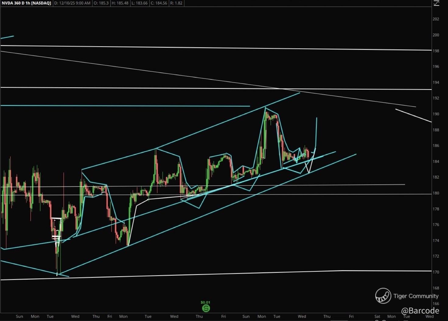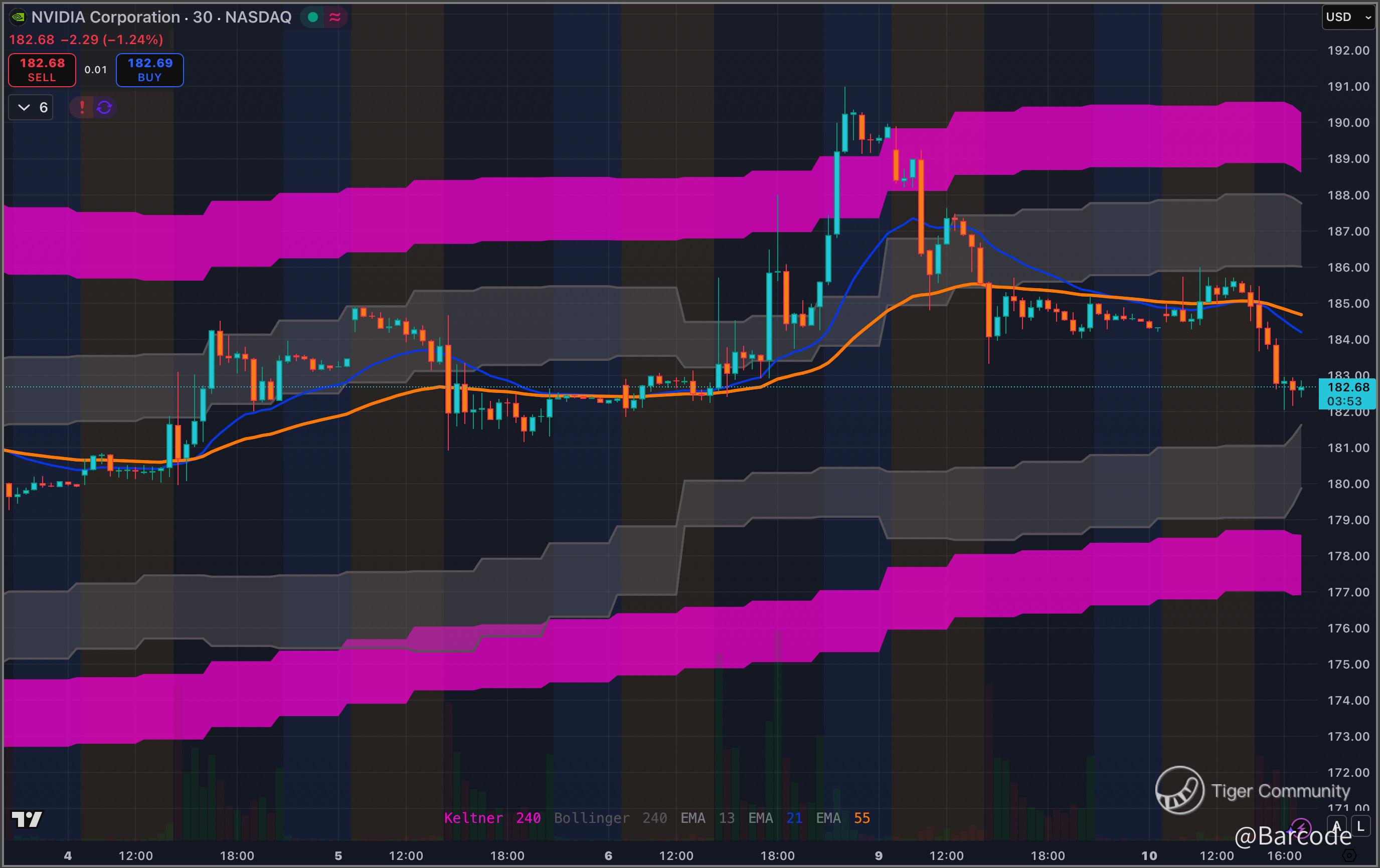 • The Keltner and Bollinger charts show $NVDA consolidating around $182 to $184, with intraday EMAs flattening and a multi week coil between roughly $172 and $192 that is primed for a spike once the current volatility compression resolves.