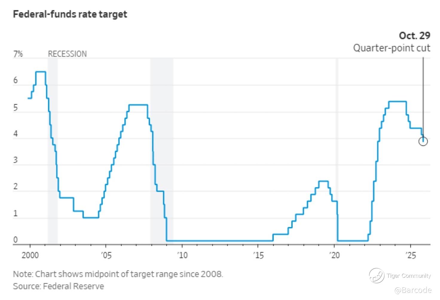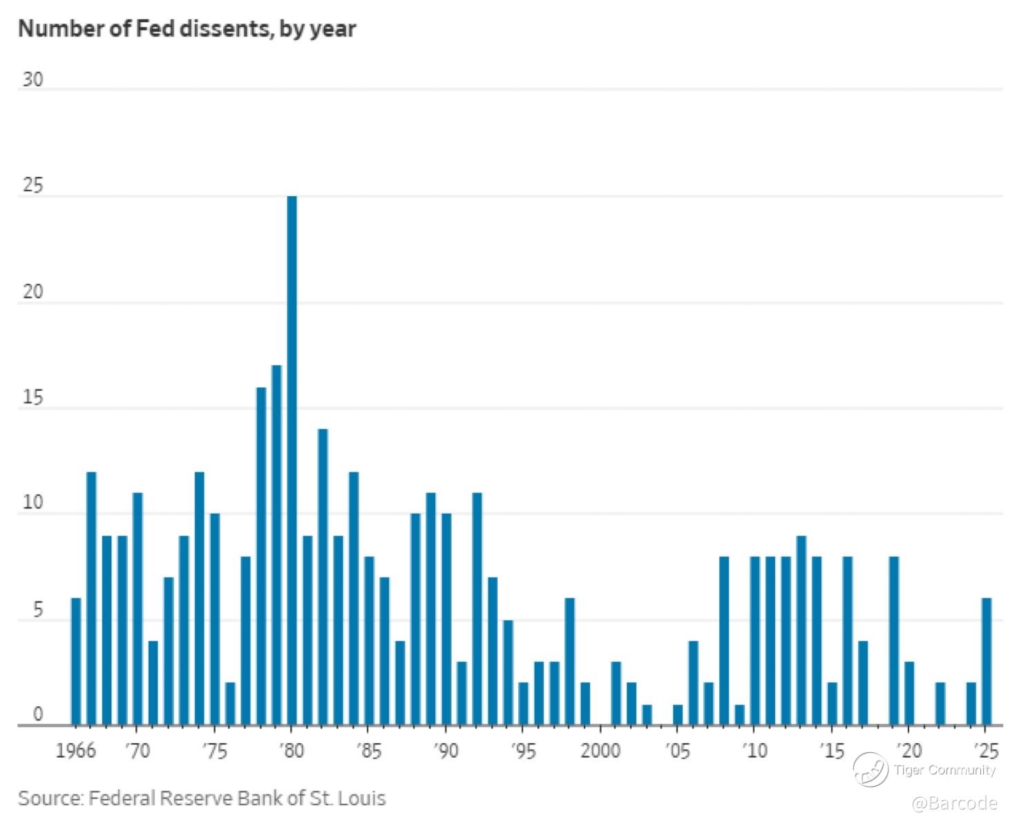 The Fed charts anchor the macro regime. The federal funds rate target has just seen a quarter point cut on 29 Oct, nudging policy away from restrictive territory after one of the most aggressive hiking cycles since the early 2000s. The headline over your visual states: Today’s Cut Will Extend Two-Decade Pattern of Policy Whiplash ⤵️. The companion chart showing the number of Fed dissents by year highlights how every major pivot in the past 50 years has been accompanied by rising internal disagreement. We are back in that zone. After today Jerome Powell has just 3 FOMC meetings left as chairman of the Fed. That is a subtle but important timing cue.