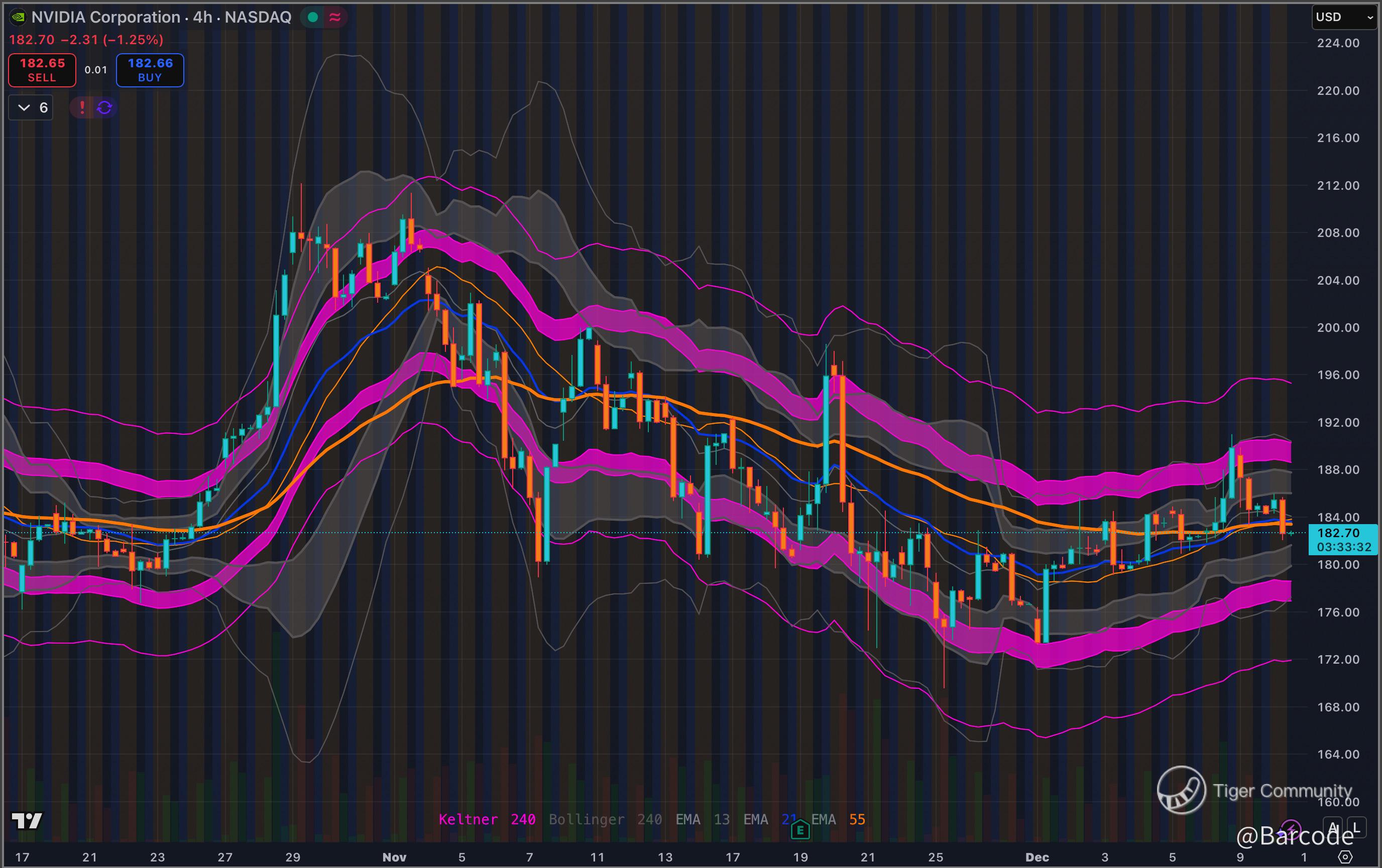 The 4 hour chart zooms out to a post peak consolidation. After the earlier slide from the low 220s down towards the mid 170s, price is now oscillating inside a broader downward sloping Keltner channel, with Bollinger bands gradually compressing. Current price at 182.70 is near the central Keltner band and roughly equidistant between resistance around 192 and support around 172. EMAs 13 and 21 are beginning to flatten and curl, the 55 EMA sits above as a trend filter. This is textbook coil behaviour after an earnings spike, and it ties directly to your comment: $NVDA FED Spike or no spike is the question. Setting up for a spike. We’ll see.
