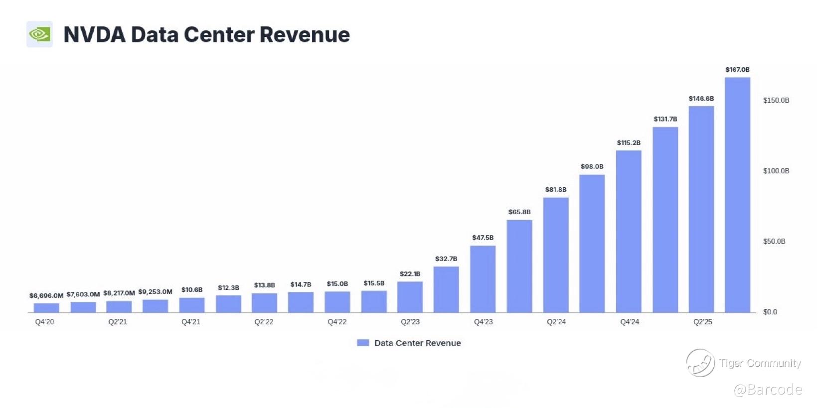 Your Data Center revenue visual reinforces this arc by charting a move from roughly $6.696B in Q4 2020, through $10.6B to $15.5B across 2021 and 2022, to $32.7B by Q2 2023, $65.8B by Q4 2023, $98.0B by Q2 2024, $115.2B by Q4 2024 and finally $167.0B by Q2 2025. That step function is the graphical expression of a full AI infrastructure super cycle.