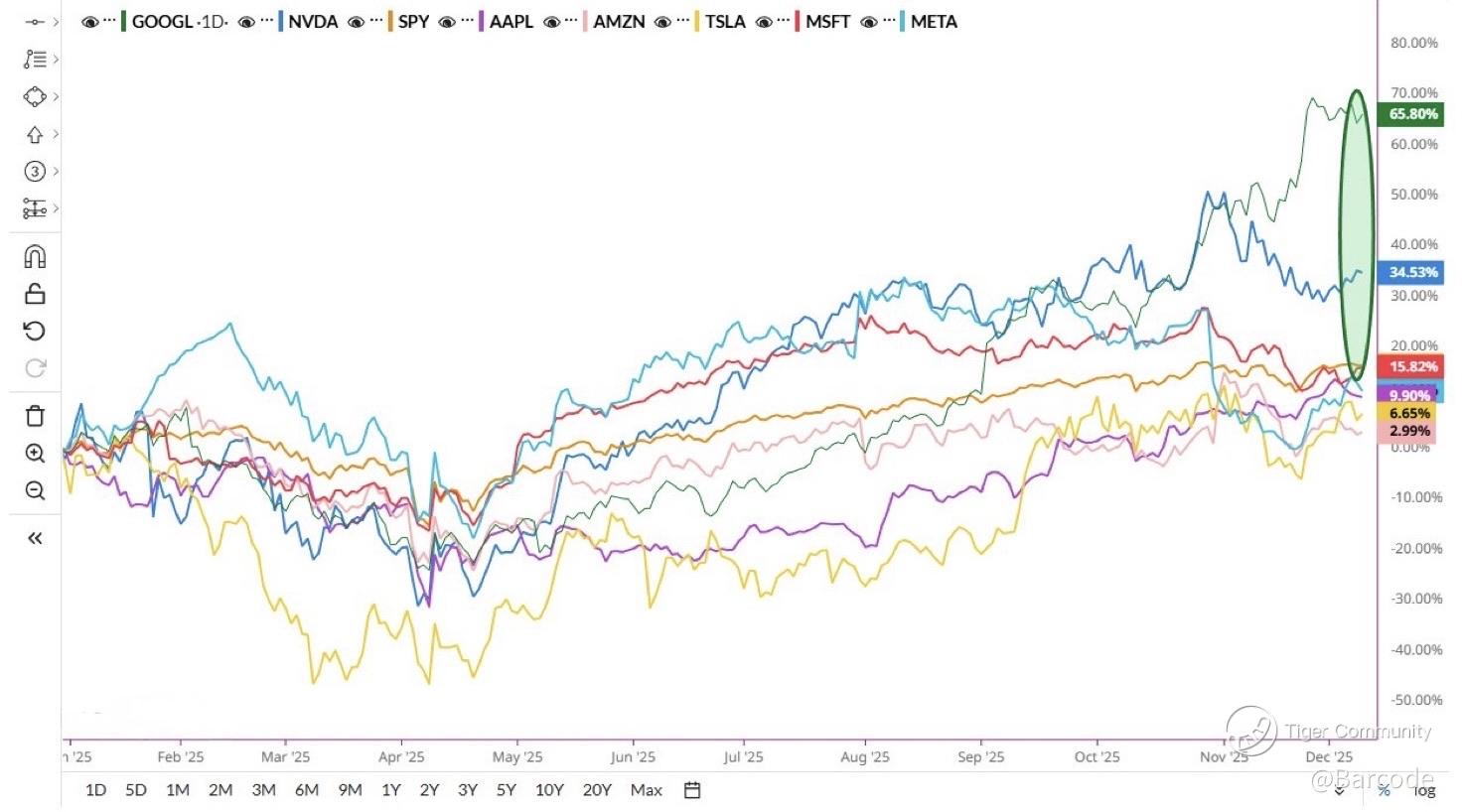 Alphabet $GOOGL and Nvidia $NVDA are now the only 2 Magnificent 7 stocks that are outperforming the S&P 500 this year 🚨🤯👀, and your uploaded relative performance chart shows $NVDA up roughly 65.80% and $GOOGL up 34.53%, well ahead of $SPY at about 15.82% and peers like $AAPL, $AMZN, $MSFT, $META and $TSLA clustered in the single to mid teens. This is already a structural rerating in progress, not a theoretical story.