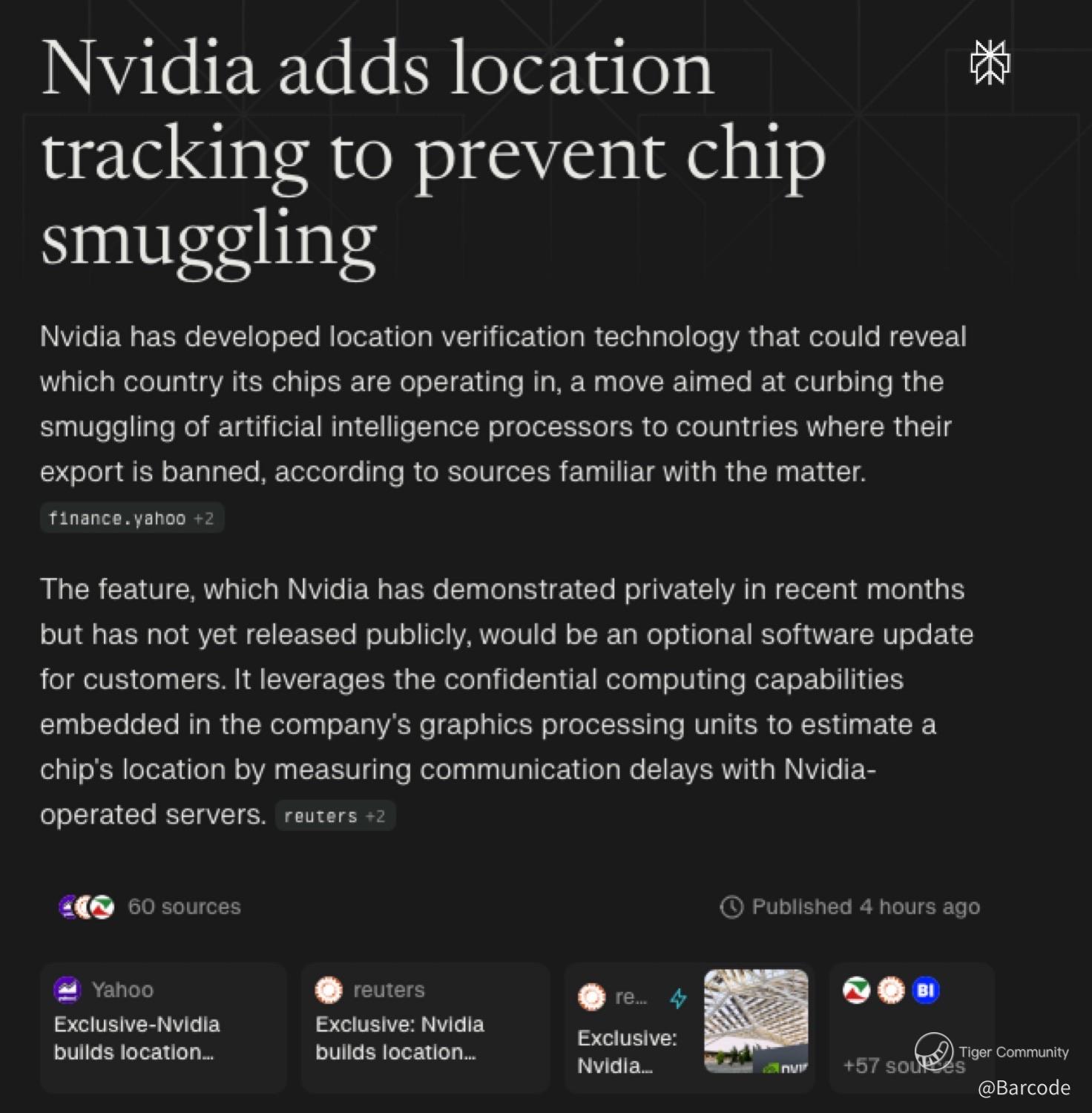 Geopolitically, the story is more nuanced. Nvidia $NVDA announced today dev of location-verification tech for GPUs.. it detects which where a chip is operating by tapping confidential computing inside GPUs to prevent restricted market smuggling. Reuters and other outlets confirm this is a direct response to U.S. pressure following seizures of illegal AI chip shipments and mounting concern about regulated chips leaking into China via Southeast Asia.  Your curated headline “China Weighs Nvidia Chip Purchase in Emergency Meetings With Tech Companies” shows Beijing scrambling to assess how to access H200 supply within new U.S. constraints. At the same time, another headline notes: BYTEDANCE AND ALIBABA KEEN TO PLACE LARGE ORDERS FOR NVIDIA H200 CHIPS AFTER TRUMP APPROVED EXPORTS.
