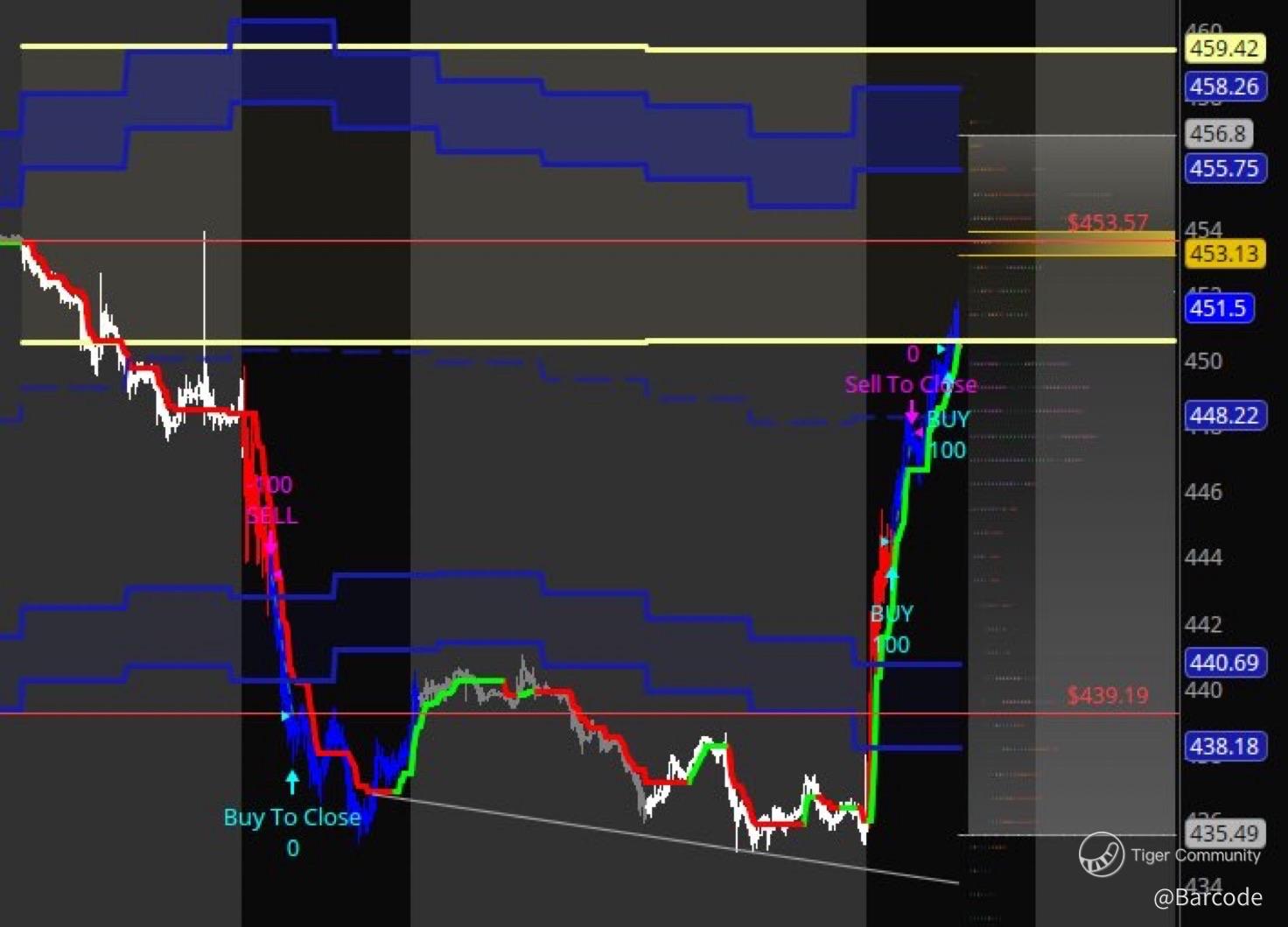 Break and hold above $450 and the path of least resistance becomes sharply higher with mechanical flow assisting aggressors.